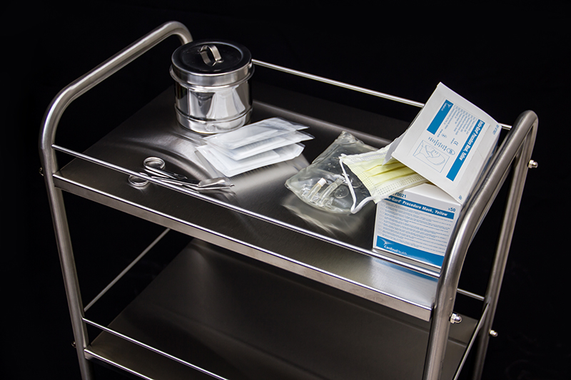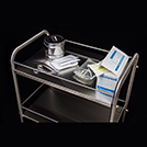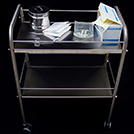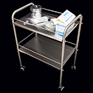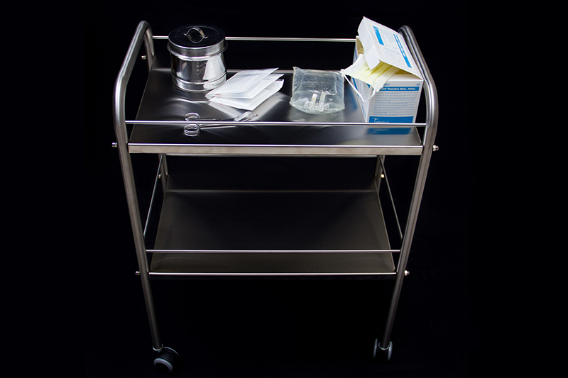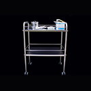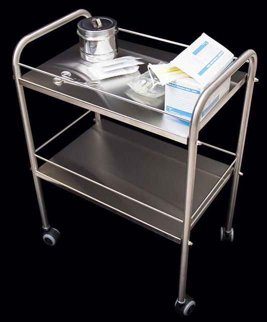 Mesa para transporte de implementos médicos en bandejas fijas de acero inoxidable y varandillas de seguridad. Cuenta con cuatro ruedas en polipropileno y banda de caucho que evita rayaduras a la superficie en que se encuentre. Estructura en tubo redondo calibre 18 con acabado en pintura, cromo o acero inoxidable.